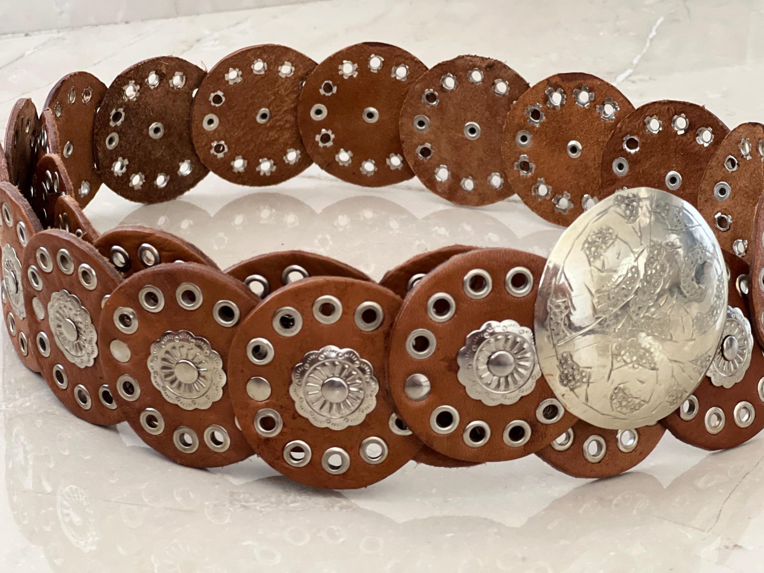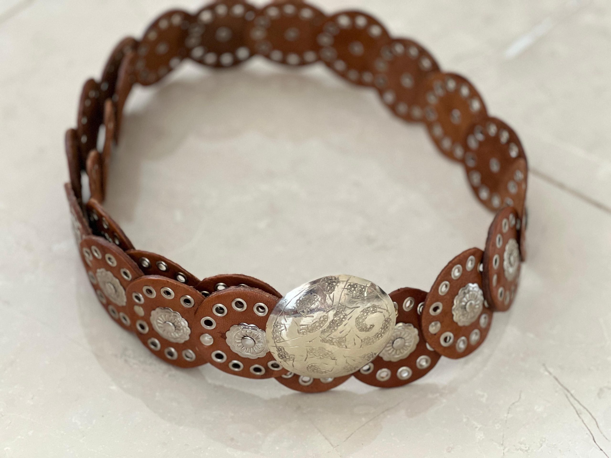 🎁 Searching for a special gift? This handmade leather concho belt (110 cm / 43.3 in) blends timeless charm with bold style. Its vintage round concho design and engraved buckle make it perfect as a medieval belt, a studded waist belt, or even a unique halloween costume belt.